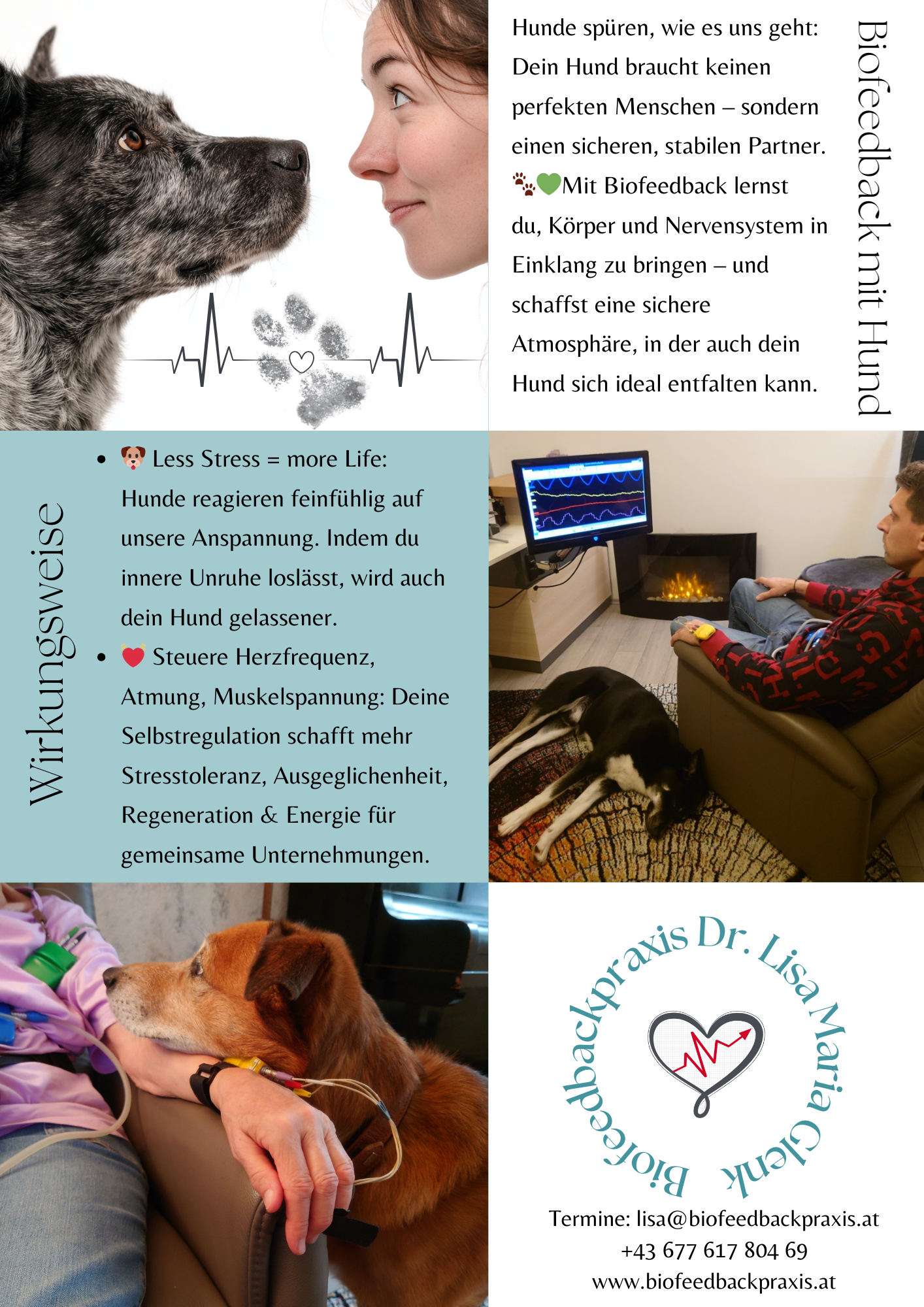 Ein bis dato ganz neuer Ansatz ist Biofeedback für Menschen gemeinsam mit ihrem eigenen Hund. Zur Ruhe kommen ist im Alltag eine sehr wichtige Fähigkeit, denn tagtäglich strömt eine Flut von Reizen und Informationen auf uns ein. Angenehme Erfahrungen mischen sich mit stressauslösenden Situationen. Für die Verarbeitung dergleichen verfügen Menschen und soziale Säugetiere über die gleichen neurobiologischen Systeme. Für mehr Ausgeglichenheit und Vitalität müssen sowohl Menschen, als auch Hunde, die angesammelte Spannung im Nervensystem auch entladen. Der Ablauf einer Session ist im Prinzip gleich wie bei konventionellem Biofeedback, allerdings mit einem Extra: in Begleitung Deines Hundes ✓ Erfahre jetzt mehr über die Biofeedback Methode ✓